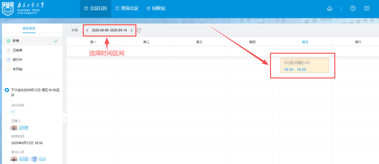 选择时间区间,可在对应时间区域看到已申请的会议,如下图所示,点击可进入签到设置页面。