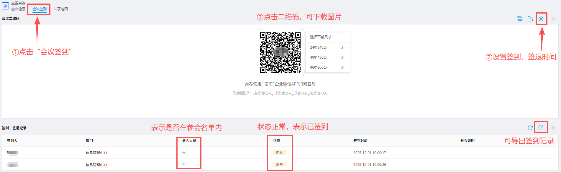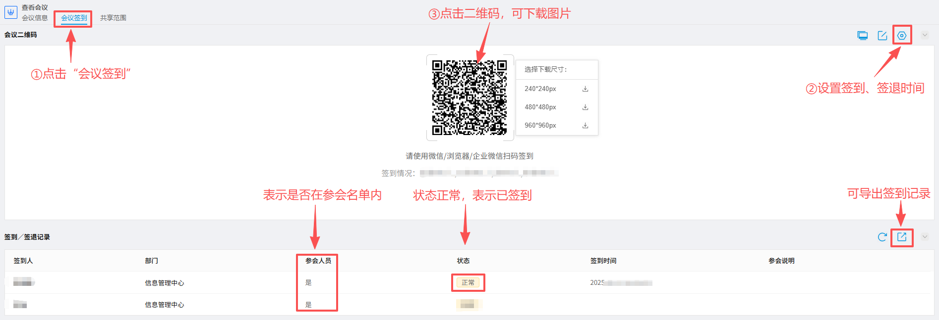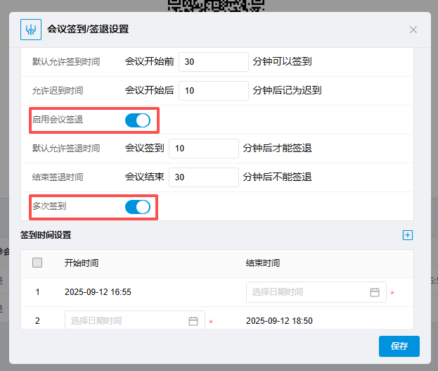 点击会议签到,可截图保存二维码,并设置具体的签到、签退时间,具体操作入口如下图所示。