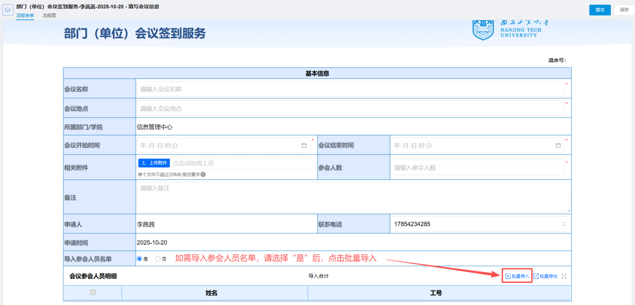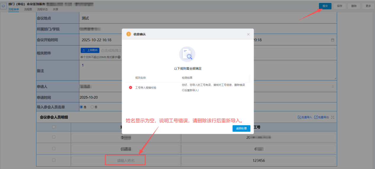 导入名单后,点击流程右上角“提交”按钮,提交部门领导审核。注意:如果导入的工号错误,流程填写页面姓名会显示为空,如下图,流程无法正常提交,请核对信息后重新导入。
