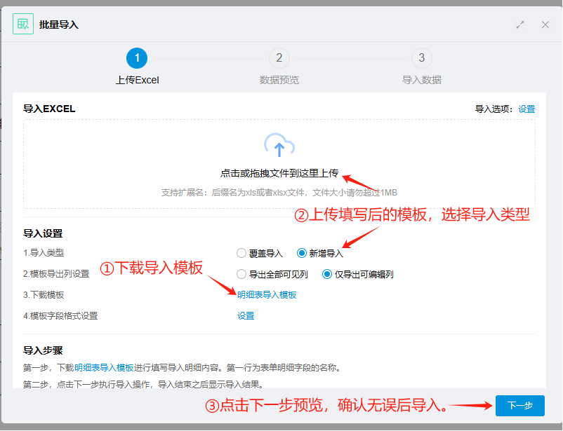 如需导入参会人员名单,可点击批量导入,下载导入模板并填写,确认导入类型后点击下一步导入,具体操作步骤如下图①-③所示。