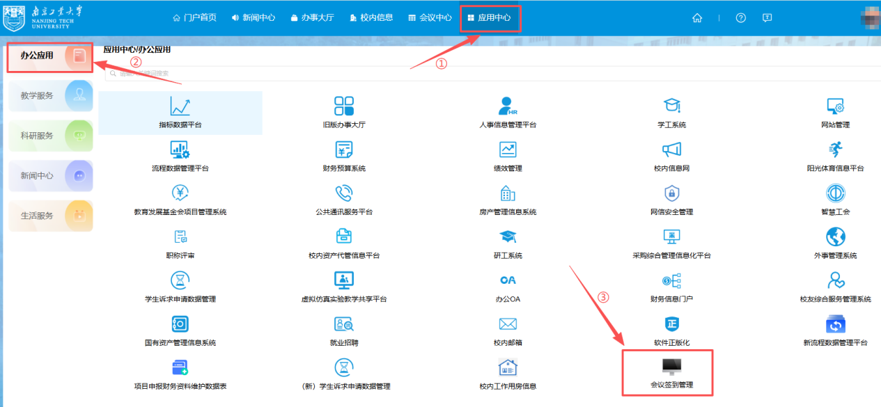 流程审核通过后,申请人可在“智慧南工”-“应用中心”-“会议签到管理”进行后台管理,具体进入步骤如下图①-③所示。