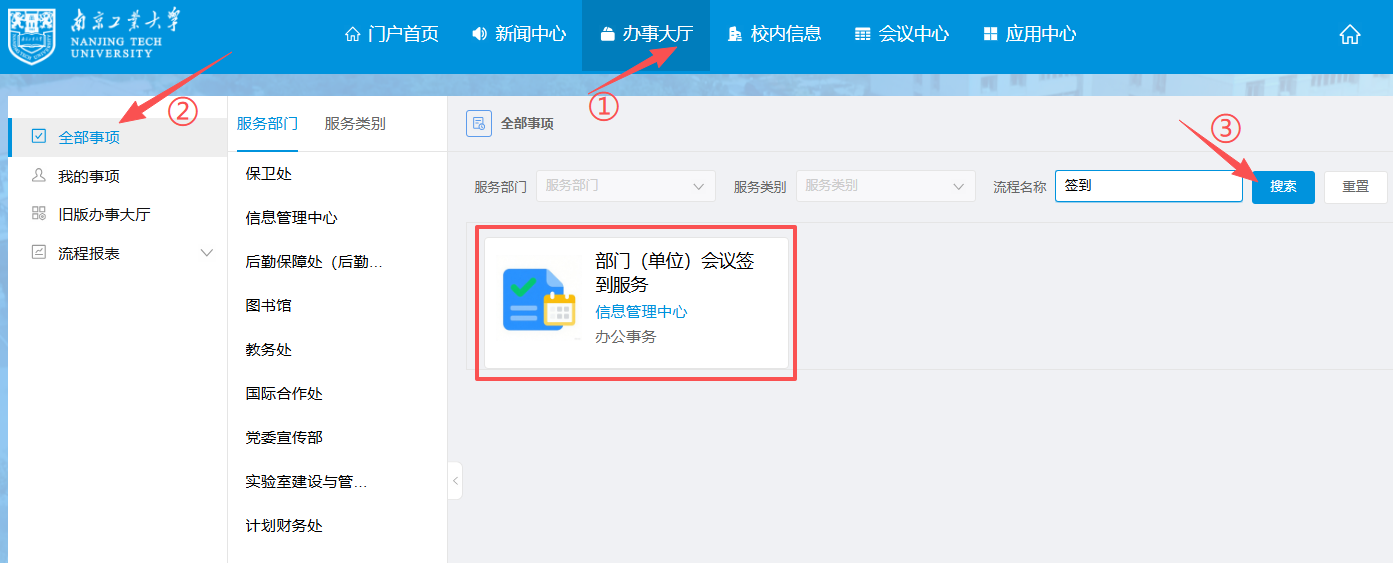 各部门信息员按下图①-③找到部门(单位)会议签到服务流程,按要求填写表单内容后提交。流程审核通过后,可到后台进行签到管理(后台管理具体参见第二部分)。